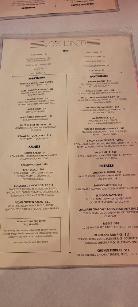 Welcome to Jo's Diner, a vibrant American breakfast and brunch spot located at 241 Ridge Way Flowood, MS 39232. This casual diner is perfect for groups, families, and even kids, offering a wide range of menu items from savory breakfast plates to small bites and indulgent Benedicts. You can enjoy classics like Country Breakfast, French Toast, and Sweet Cream Pancakes, or try unique dishes like Shrimp Avocado Toast or Beignets. The Benedicts are a must-try with options like Crabcake Benedict and Cajun Crawfish Benedict. Jo's Diner also offers delivery, takeout, and reservations, making it convenient for everyone. With a full bar, outdoor seating, and dog-friendly policy, this diner has something for everyone. Overall, Jo's Diner is a bustling hub of delicious food and friendly service that is sure to leave you satisfied and planning your next visit.